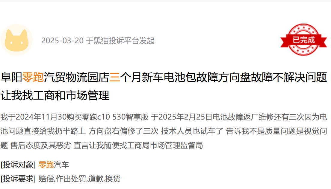 据媒体报道,2024年,零跑在车质网和中国网汽车质量投诉平台分别收到885起和225起投诉,涉及减震异响、动力系统故障、刹车失灵、跑偏等问题。